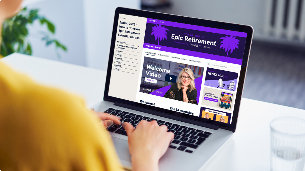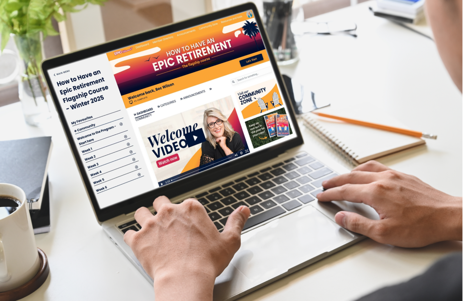 The Epic Retirement Flagship Course is a 6 week online education program, run synchronously and hosted by Bec Wilson. (Synchronously means we all do it together at the same time!). It is designed to help you truly grasp and action the lessons surrounding Epic Retirement.